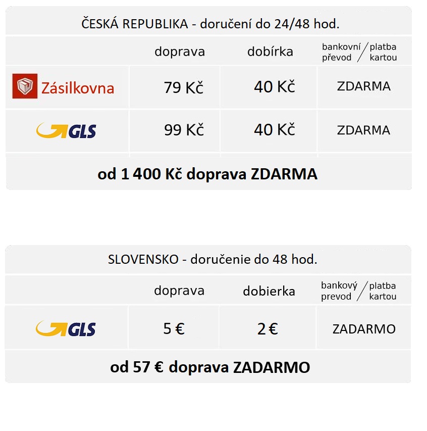Objednávky přijaté v pracovních dnech do 12:00hod. expedujeme tentýž den. Následné doručování zásilek probíhá do 24/48hod.
